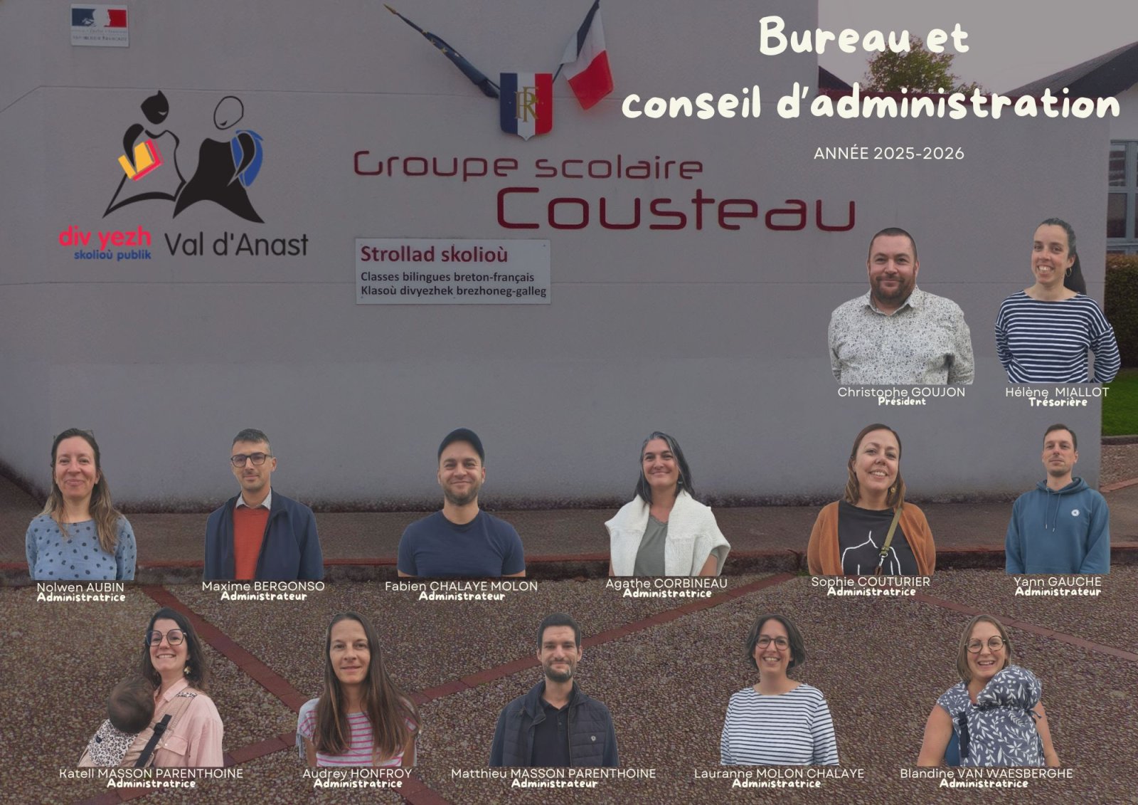 Le conseil d'administration qui s'est réuni jeudi 9 octobre 2025 pour sa première réunion, a fait le choix d'élire un bureau resserré de deux personnes, Christophe GOUJON en qualité de président et Hélène MIALLOT en qualité de trésorière, tous les deux membres fondateurs et historiques de div yezh Val d'Anast, qui assureront la gestion et l'administration au quotidien de l'association. Le conseil d'administration quant à lui sera organisé en commissions dont la vie scolaire qui sera un point d'attention important pour cette nouvelle année mais également pour l'organisation des projets et actions à venir que le conseil d'administration entend mener.