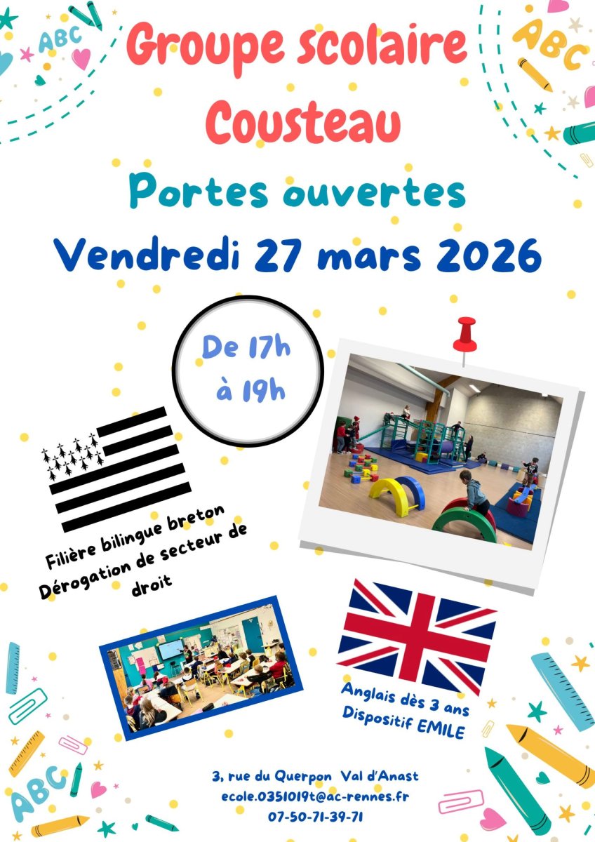 A Val d'Anast, le Groupe Scolaire Cousteau et sa filière bilingue français-breton fait ses portes ouvertes le vendredi 27 mars 2026 de 17h à 19h.
